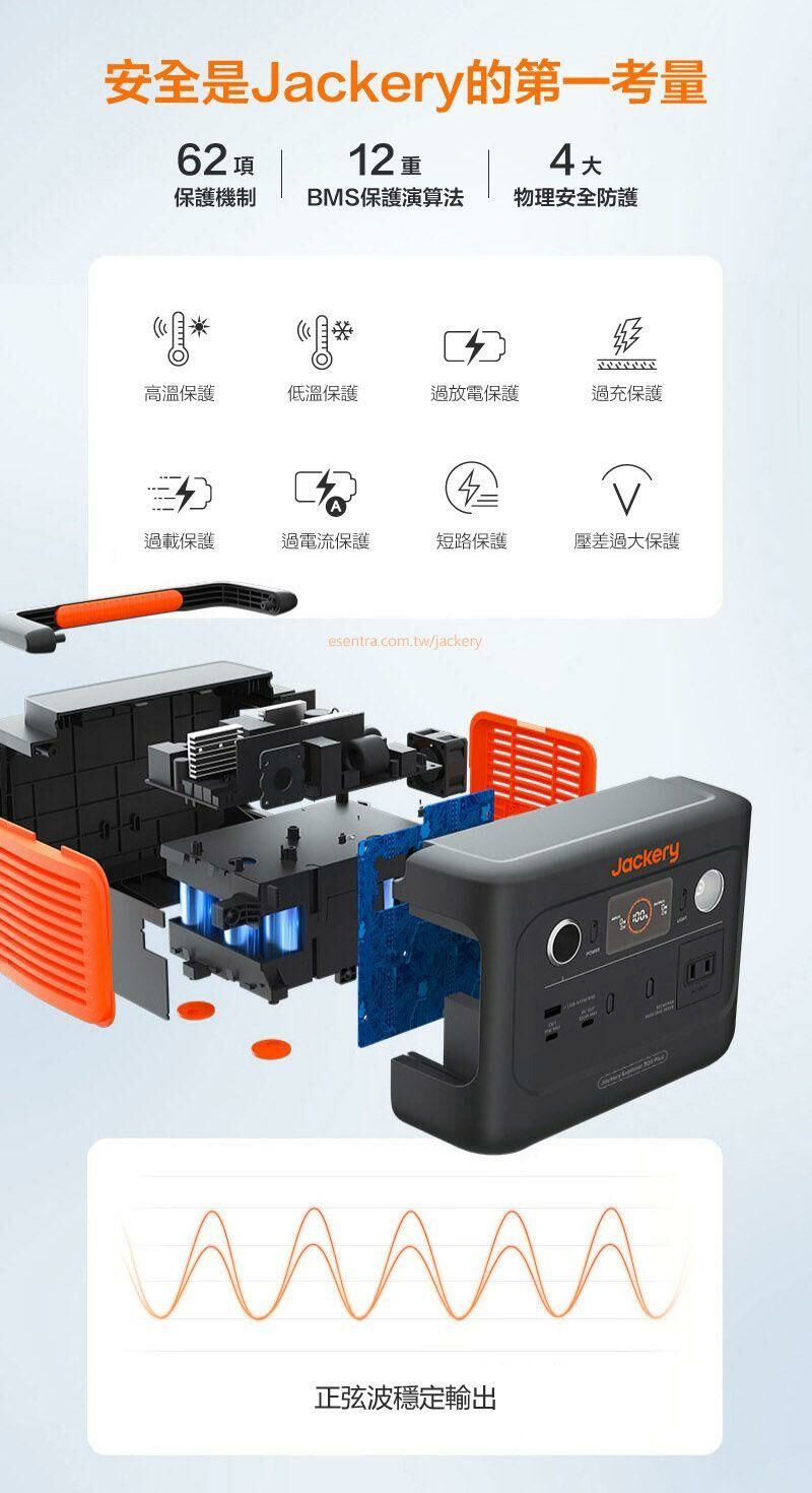 Jackery 300 Plus 儲能行動電源採用正弦波穩定輸出,避免因電壓、電流不穩導致電器易發生的損壞。同時具有62項保護機制、12重BMS保護演算法,以及4大物理安全防護,隨時守護用戶安全。