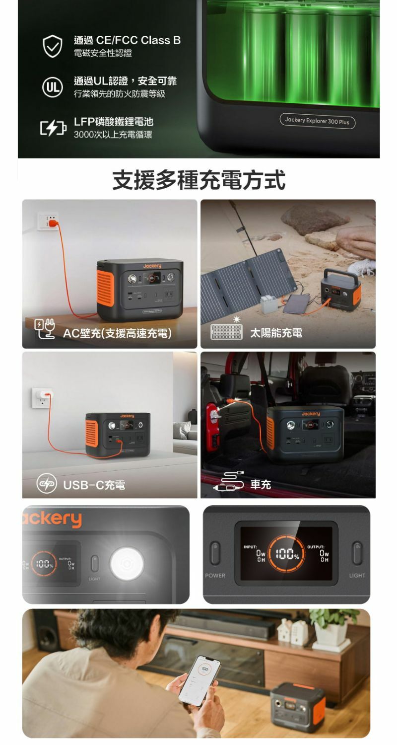 Jackery 300 Plus 支援以下4種充電方式: