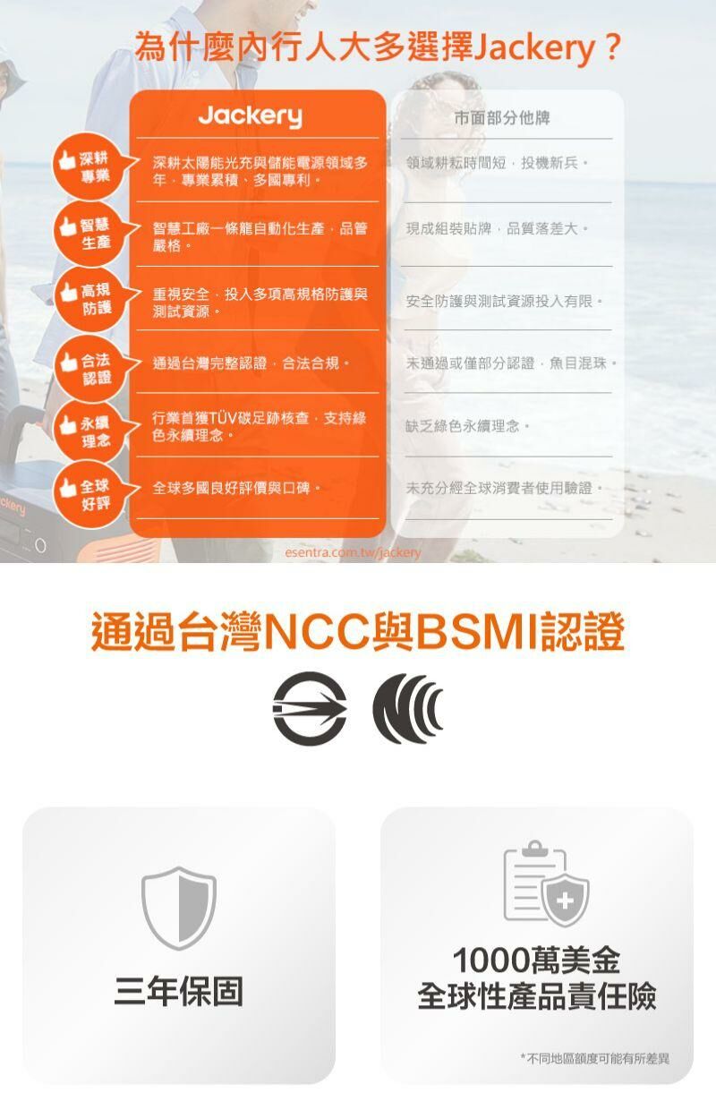 Jackery產品完整通過台灣BSMI與NCC認證,且符合台灣相關電力規範。