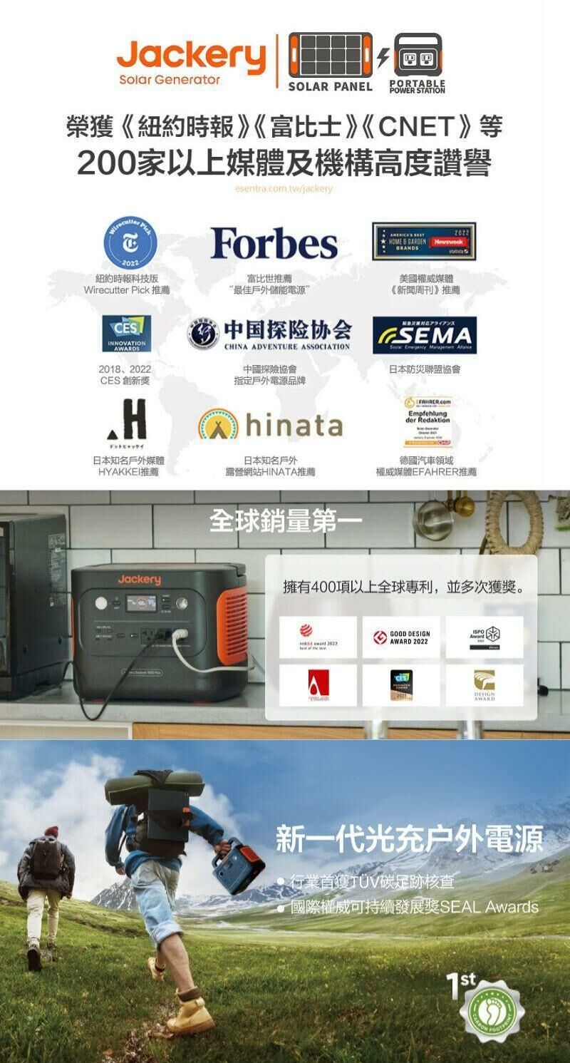 Jackery 為全球銷量第一的儲能電源領導品牌,外媒評為「最佳光充戶外儲能電源」,並獲得日本防災協會推薦及家電大賞金賞。