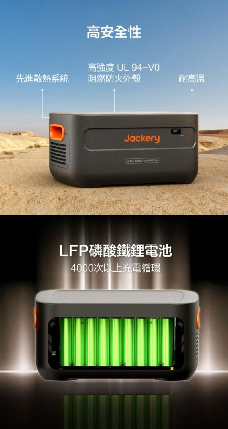 適用Jackery 1000 Plus的擴充電池包使用LFP磷酸鐵鋰電池,即使超過4000次以上充電循環仍能維持70%以上電量。